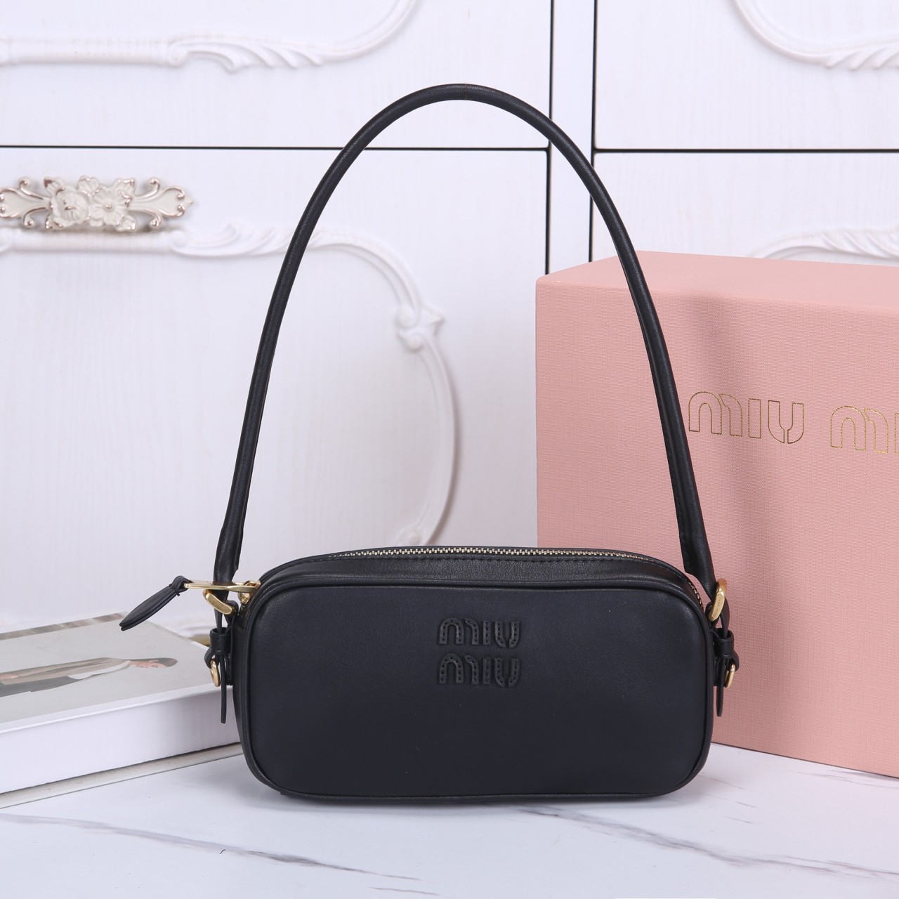 부드러운 카프스킨 소재의 직사각형 미니 숄더백입니다. 컴팩트한 바디 중앙에 톤온톤 미우미우 레터링 로고가 음각되어 있으며, 짧은 숄더 스트랩이 제공됩니다. 단순하면서도 세련된 디자인으로 트렌디한 데일리 룩에 포인트 주기 좋은 미니멀한 호보 스타일의 백입니다.