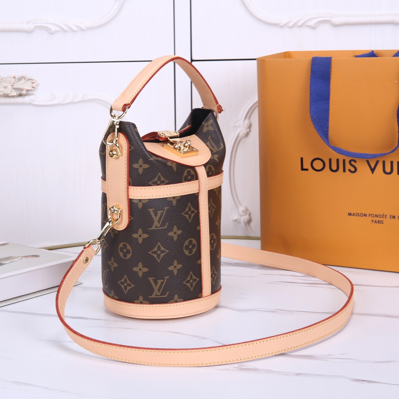 루이 비통의 상징적인 노에 백을 축소한 미니 버전입니다. 모노그램 캔버스와 천연 카우하이드 가죽 트리밍이 특징이며, 클래식한 버킷 형태와 토트 핸들, 그리고 탈착 가능한 크로스 바디 스트랩이 제공됩니다. 샴페인 운반용으로 디자인된 노에의 우아한 역사를 담고 있는 매력적인 미니 백입니다.