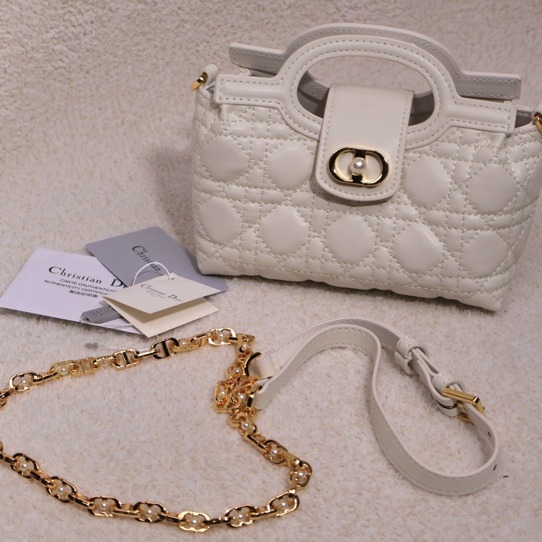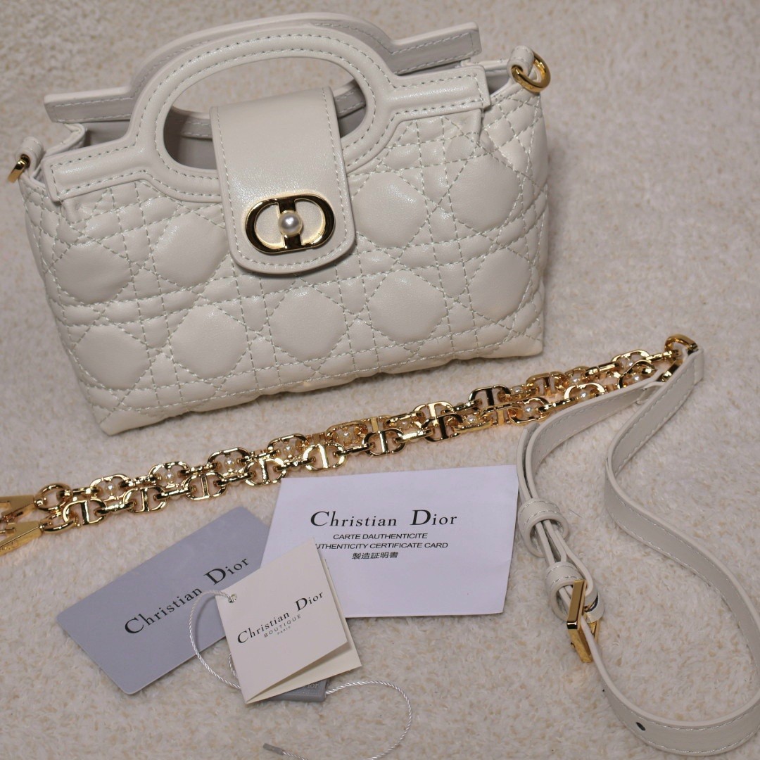 ? 플랩에 골드 CD 로고 + 화이트 레진(진주 느낌) 장식 포인트가 들어가 디테일이 정말 예쁩니다.