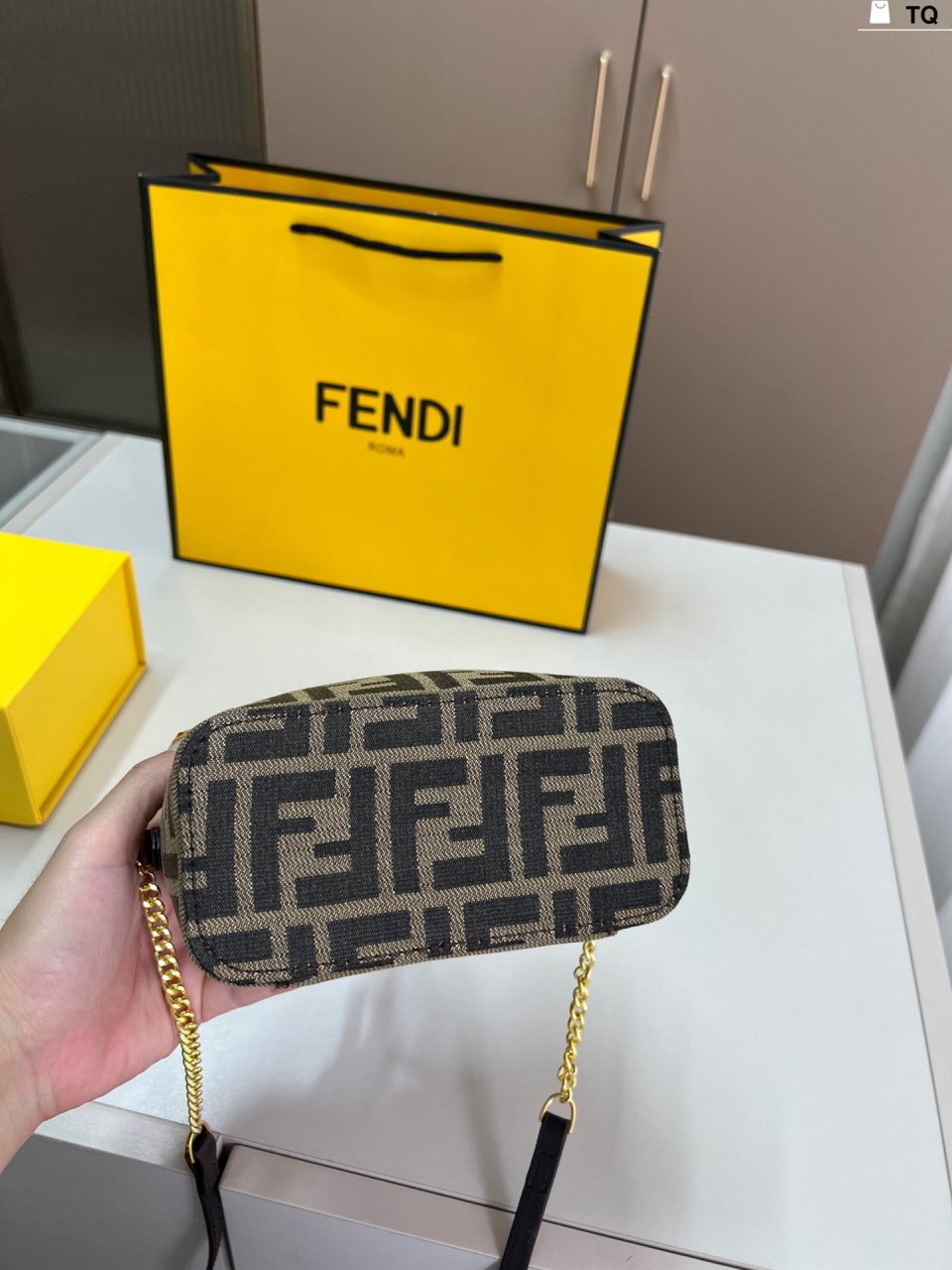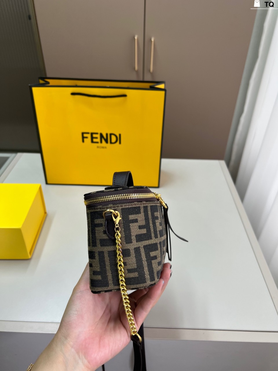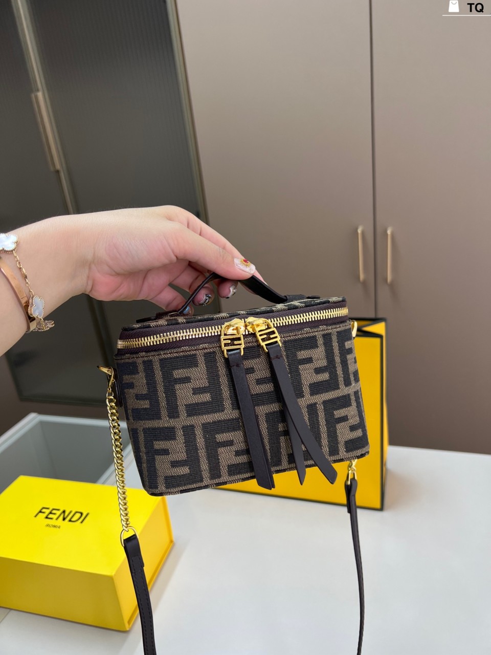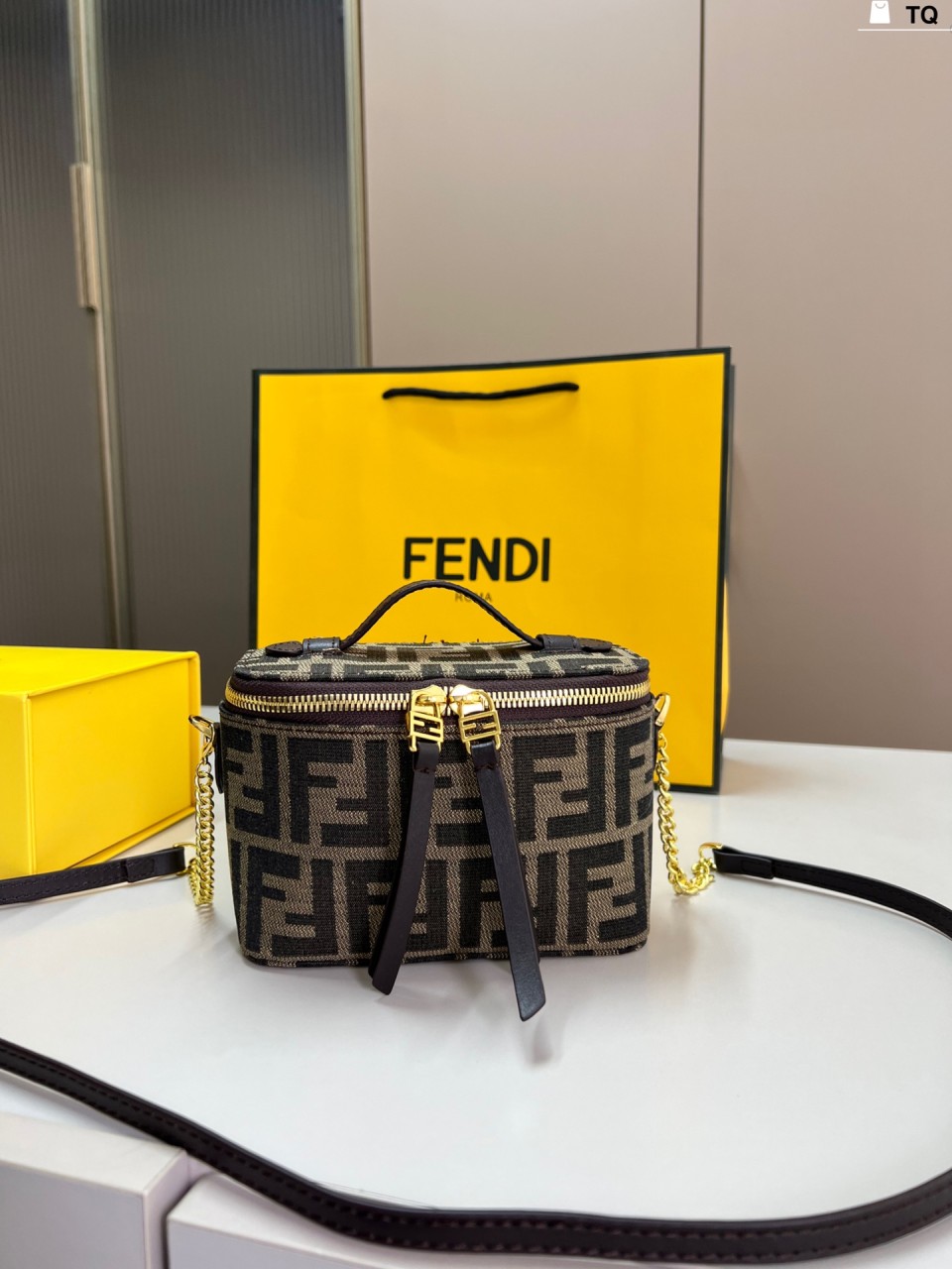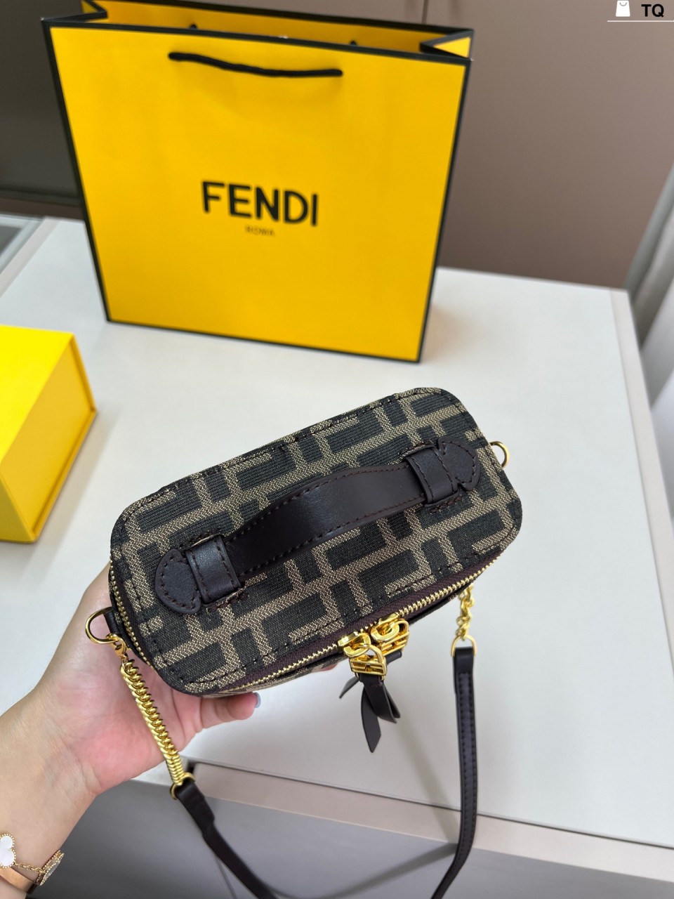 펜디 배니티 토바코 브라운 FF 자카드 패브릭 미니 백