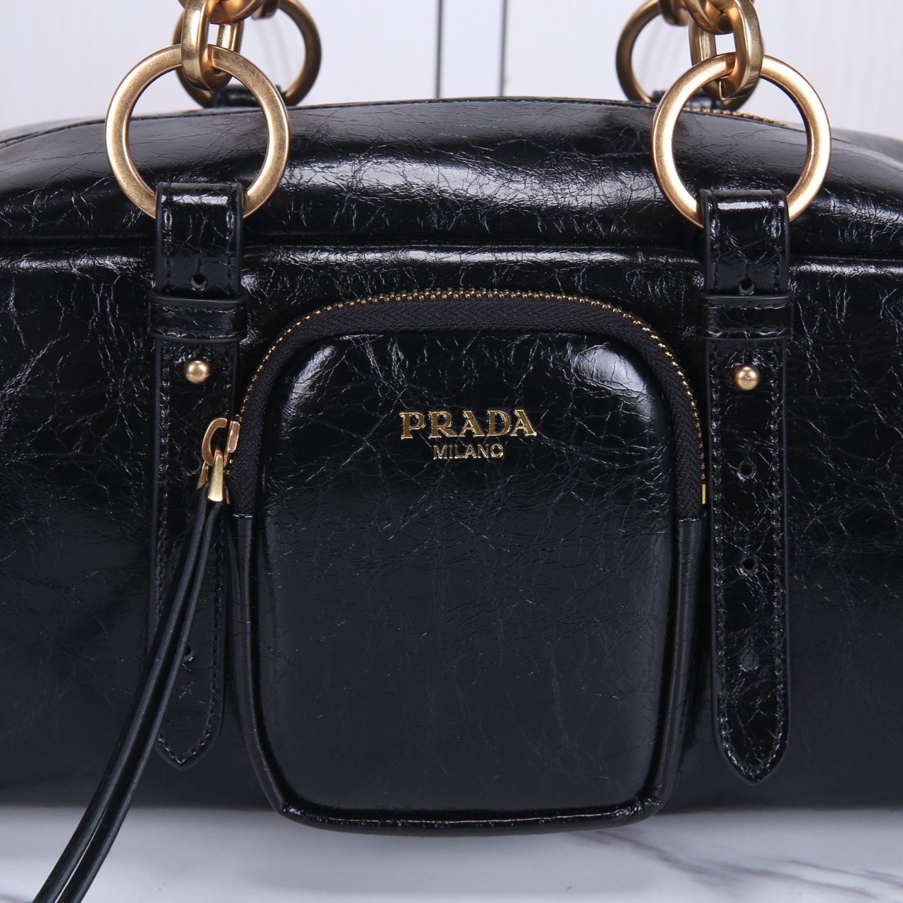 광택감 있는 블랙 빈티지 레더 소재의 컴팩트 호보백입니다. 숄더 스트랩 연결부에 골드 톤 O-링 디테일이 특징이며, 전면에 지퍼 포켓과 프라다 밀라노 로고가 장식되어 있습니다. 실용적인 사이즈와 유니크한 소재감으로 트렌디하면서도 시크한 분위기를 연출하는 데일리 숄더백입니다.