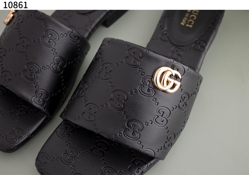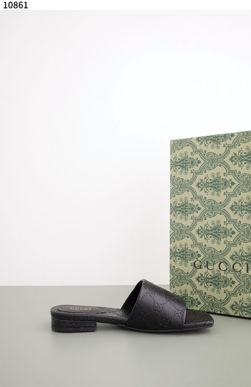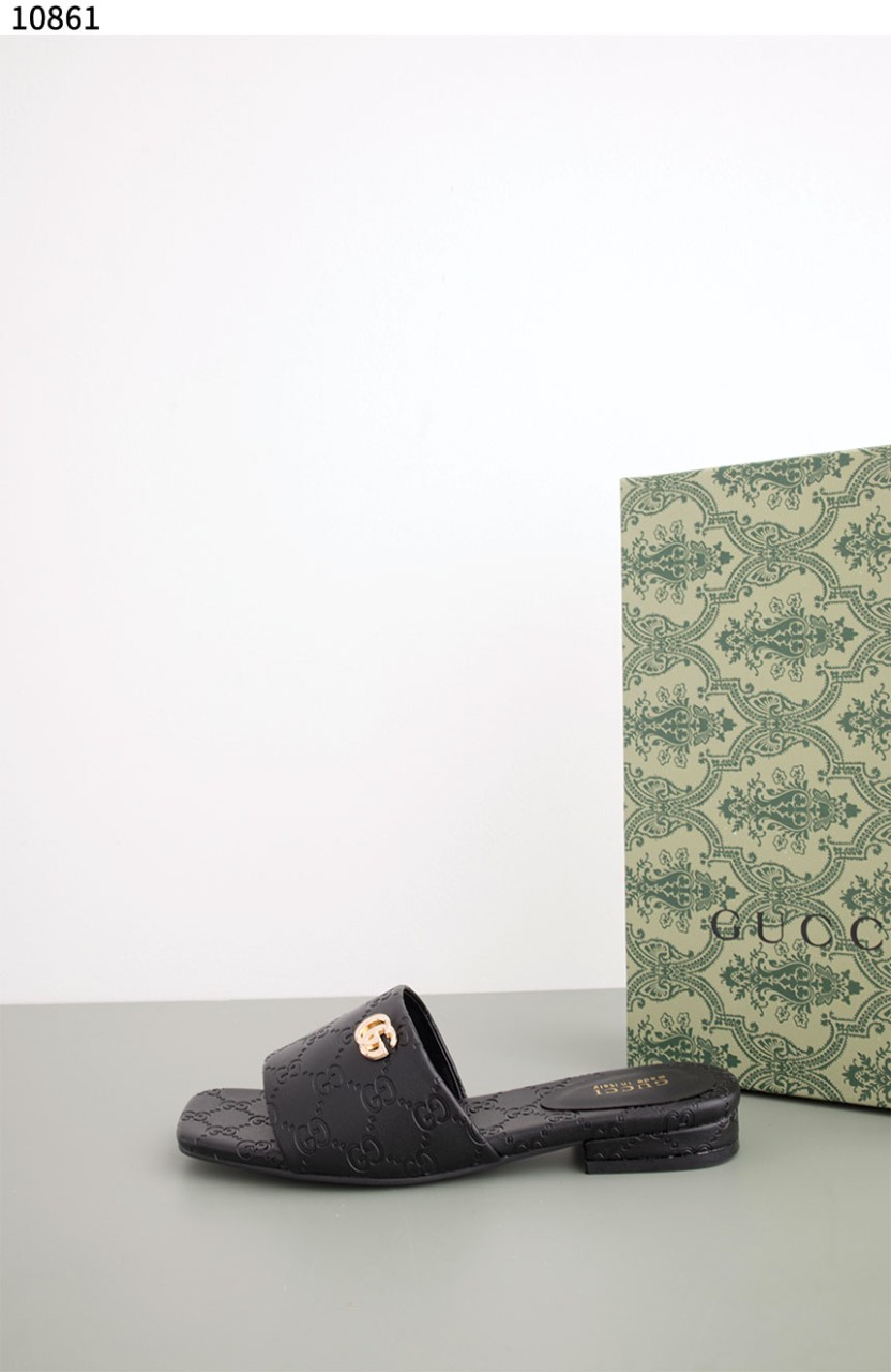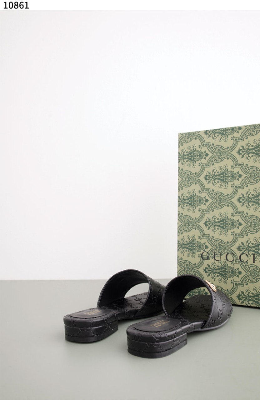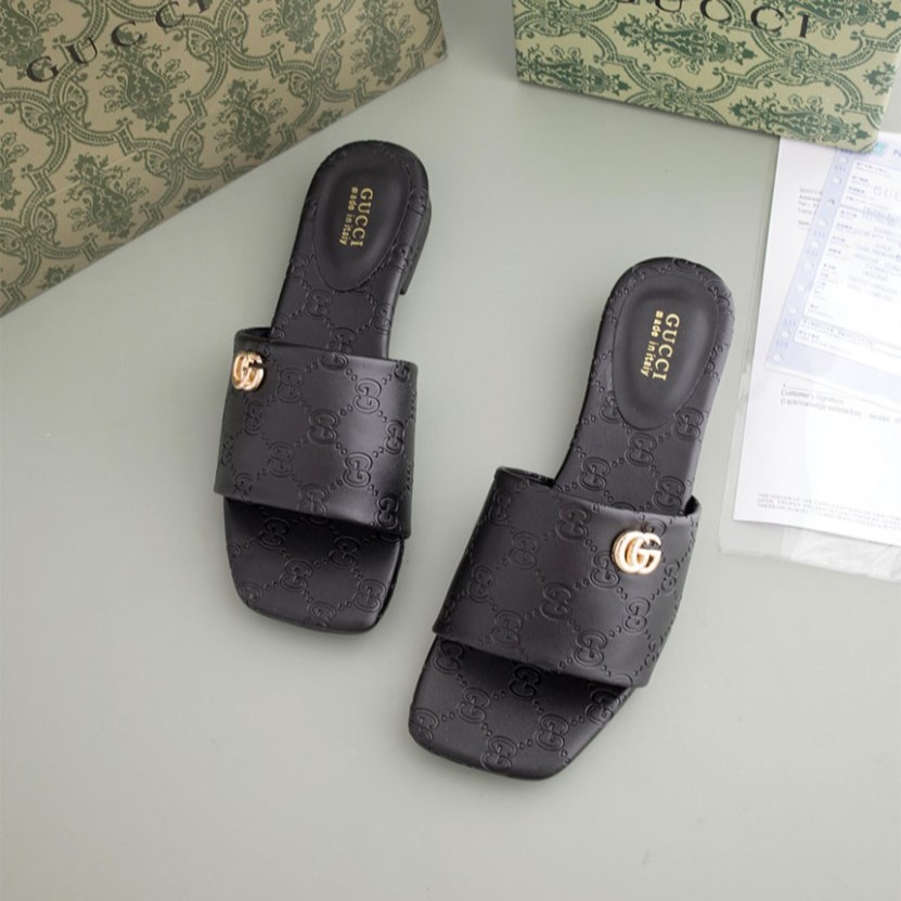[GUCCI] 블랙 GG 레더 여성 더블 G 슬라이드 샌들