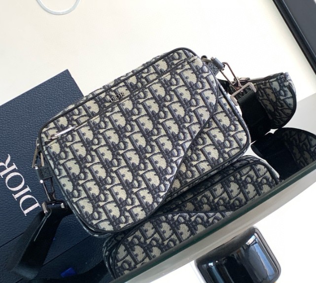 디올 크로스 새들 트리플 파우치 오블리크 자카드 블랙 / 네이비